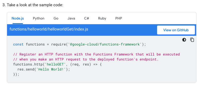 例1では灰色の長方形内にサンプルが書かれています。また例2では、プログラミング言語別にサンプルが表示されます。